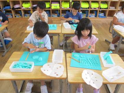 ねん土を使い、ごちそうをつくりました。初めに「ごちそう」と聞いて思い浮かべるものを出し合ってからつくりました。おいしそうな作品が、たくさんそろいました。