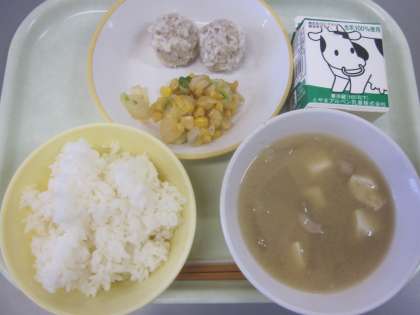今日の献立は「ご飯、牛乳、チンズワンズ、コーン和え、さつま汁」でした。今日もおいしくいただきました。