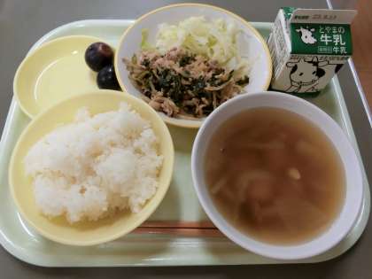 今日の献立は、「ご飯、牛乳、豚キムチ丼、ゆでキャベツ、茎わかめのスープ、巨峰」でした。巨峰などの果物には、「ブドウ糖」と言われる糖分がたくさん含まれていて、体の疲れをとってくれる働きがあります。まだまだ暑いこの時期の、エネルギー補給にぴったりですね。
