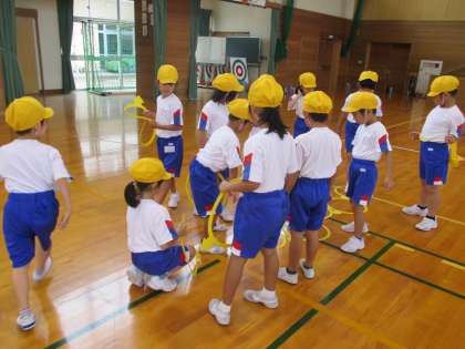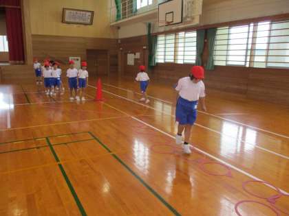 体育の時間は、色団ごとに「けんけんぱ」のコースをつくりました。どんなコースにするかを話し合いながら、つくり変えていました。