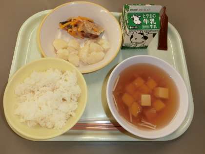 今日の献立は「ご飯、牛乳、ふくらぎのマリネ、粉ふきいも、すまし汁、ミルメーク」でした。今日は、給食委員会で企画した、牛乳を好きになろうオリンピックで1位に選ばれた、ミルメークのココア味が給食につきました。楽しみにしていたミルメークで子供たちは、牛乳をおいしくいただきました。