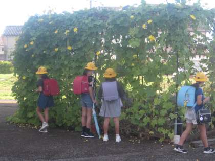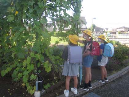 登校した4年生の子供たちがヘチマを見ています。