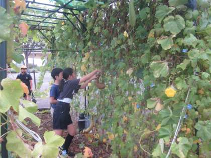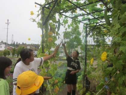 4年生が登校し、いつものようにヘチマ畑を観察していると、実の下の方から種があふれ出ています。