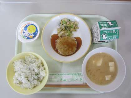 今日の献立は「菜めし、牛乳、しらたまじる、おひたし、お月見ゼリー」でした。おいしくいただきました。