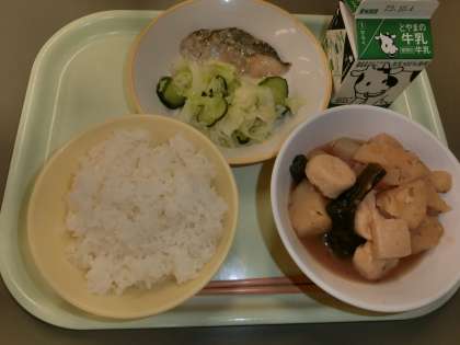 今日の献立は「ご飯、牛乳、さわらの西京焼き、きざみ和え、炊き合わせ」でした。おいしくいただきました。