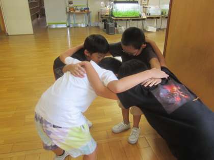 廊下を歩いていると、肩を組んでいる子供たちに出会いました。お笑い係の子供たちで、「これからみんなをたくさん笑わせるぞ」と気合いを入れているとのことでした。ほほえましい姿でした。