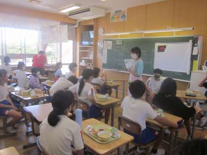 栄養職員の今日の献立の説明を聞いています。