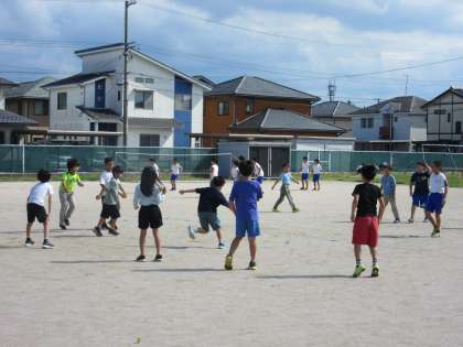クラスのクイズをグループごとに考えたり、ドッジボールで思い切り体を動かしたりしています。みんな笑顔で楽しんでいます。