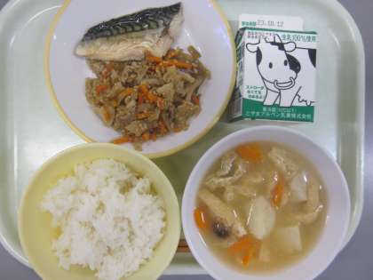 今日の献立は「ご飯、牛乳、サバの塩焼き、きんぴら、五目みそ汁」でした。