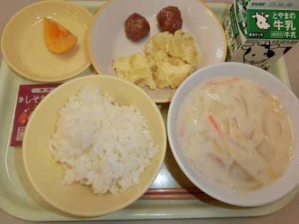 今日の献立は「ご飯、牛乳、ミートボール、チーズおさつ、豆乳野菜スープ、柿、しそかつおふりかけ」でした。今日の献立は、さつまいもや柿など秋の味覚をおいしくいただきました。 ごちそうさまでした。