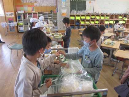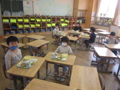 てきぱきと配膳、よい姿勢で待つことができている1年生です。