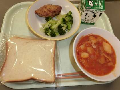 今日の献立は「食パン、牛乳、さかなのえごま揚げ、そえ野菜、豆とベーコンのトマト煮」です。今日のトマト煮は、白花豆という白くて大きな豆が入っていました。ほくほくとしていて、じゃがいもといっしょにおいしくいただきました。