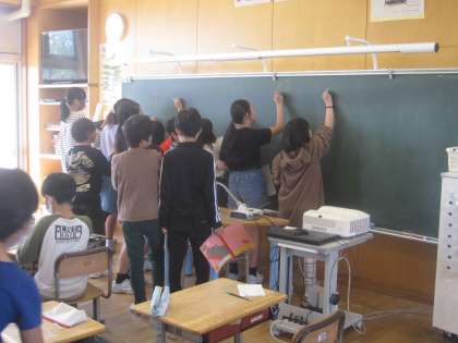 自分がつくった文章を黒板に書いています。