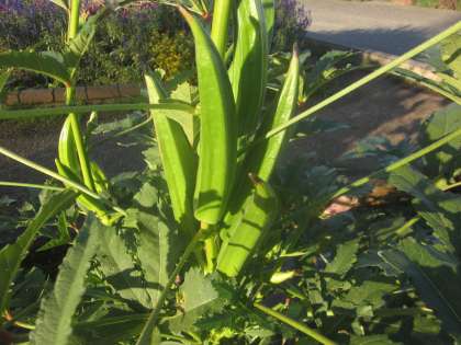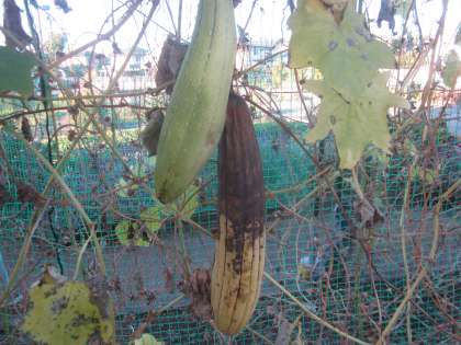 ヘチマの葉はほとんど枯れました。 オクラは元気です。