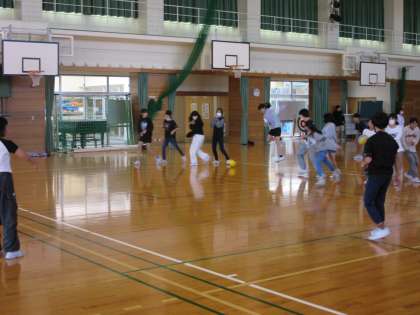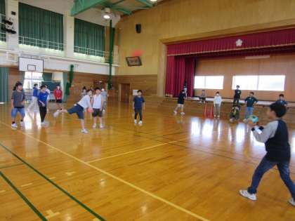 みんなが楽しく活動できるために、ルールの工夫を考えてドッジボールをしています。外野がない「アメリカンドッジボール」と、投げる人を限定した特別ボールを使ったドッジボールをみんなで楽しんでいます。