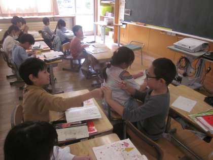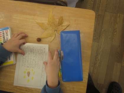 校庭でドングリや落ち葉を拾ってきました。 拾ってきたものを見せ合っています。