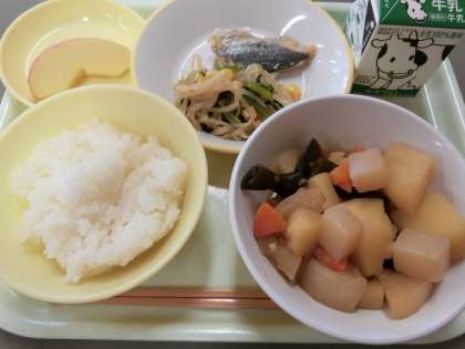 今日の献立は「ご飯、牛乳、鰆のゆうあん焼き、コーン和え、おでん、りんご」でした。おでんがおいしい季節なりました。給食では、かつおぶしでだしをとりました。味がしみこんでいておいしくいただきました。
