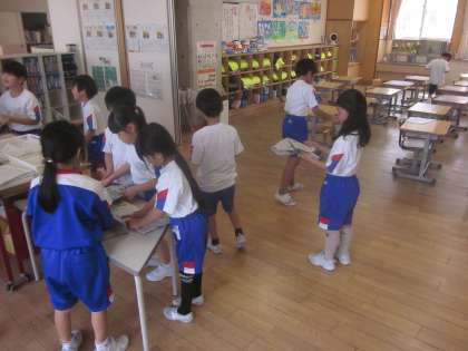 紙鉄砲で腕を振り下ろす練習をしています。