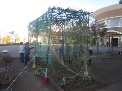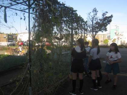 4年生がヘチマを収穫しています。