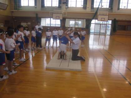 大きな前転、壁倒立ができたら、講師の先生に補助していただき、倒立前転です。