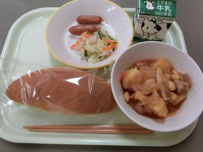 今日の献立は「コッペパン、牛乳、あらびきウインナー、大根サラダ、ポークビーンズ」でした。今日もおいしくいただきました。