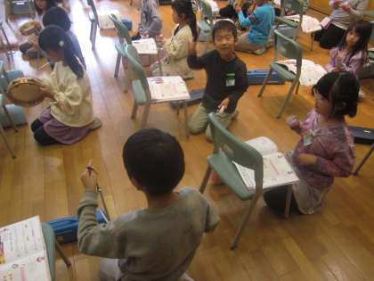 音楽に合わせて「タンブリン、カスタネット、鈴、トライアングル」を鳴らしています。