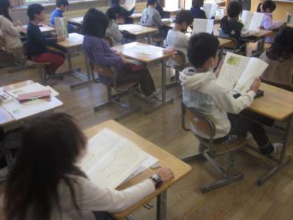 自分の考えをワークシートに書き込み、話し合っています。