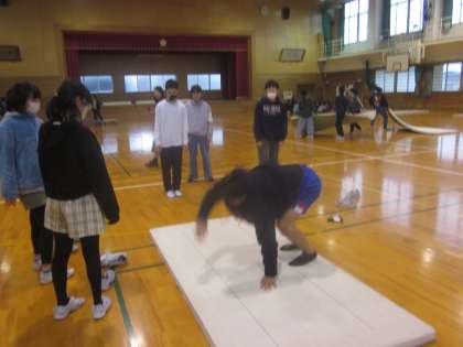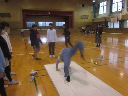壁登り倒立、壁倒立、補助倒立、倒立前転に取り組みます。