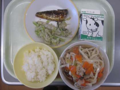 今日の献立は「ご飯、牛乳、いわしの生姜味、ゆかり和え、五目うどん」でした。
