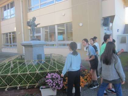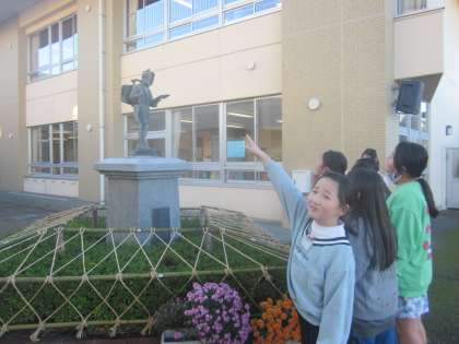 本校にある銅像は旧校舎から運んできたことを話したところ、驚いていました。
