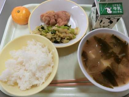 今日の献立は「ご飯、牛乳、鶏肉の唐揚げ、小松菜ひたし、じゃがいものみそ汁、みかん」でした。今日のみかんは、甘くておいしいみかんでした。冬の代表的な果物のみかんは、ビタミンCがたくさん含まれています。
