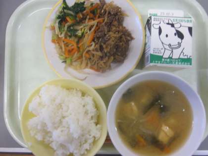 今日の献立は「ご飯、牛乳、ビビンバ(焼肉、ナムル)、みそ汁」でした。
