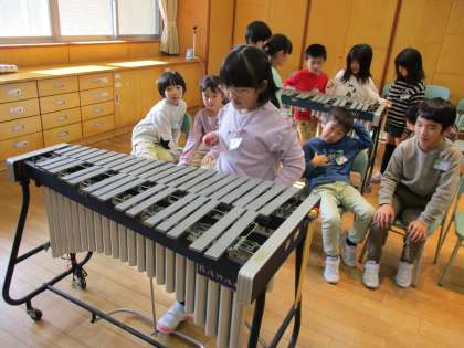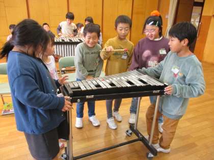 音楽の時間に、鉄琴の演奏の仕方を学習しました。どうしたら美しく響く音が出るか、何度も試しています。
