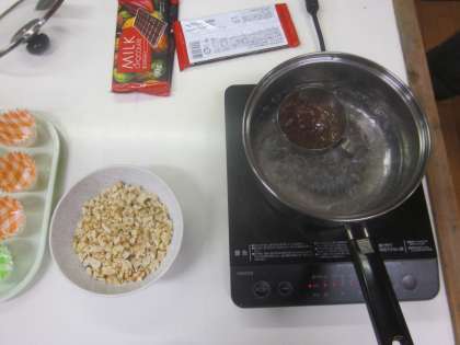 板チョコを溶かして容器に流し込み、ピーナッツを添えればできあがりです。