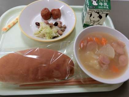 今日の献立は「コッペパン、牛乳、ミックスビーンズのマリネ、野菜のスープ煮、棒チーズ」でした。今日の野菜のスープ煮は、大根やじゃがいもなどの野菜がたくさん入ったスープ煮でした。今日は、とても寒かったので、スープ煮で体の中から温まりました。