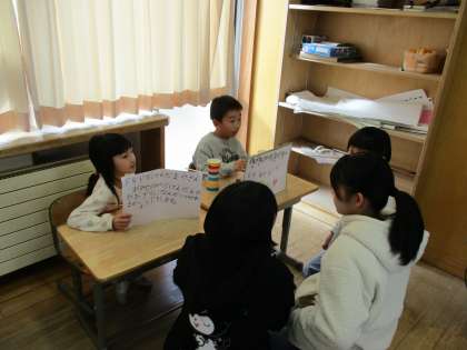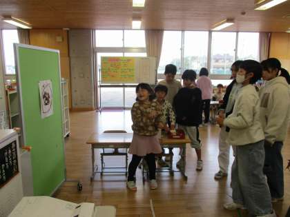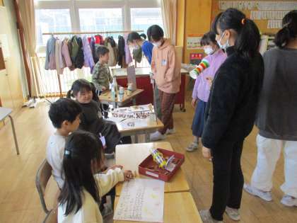 あきまつりのスタートです。ゲームコーナーや作品展など、おもしろいお店がたくさん開かれました。「6年生さんの思い出に残りますように」という思いを込めて、お土産を渡すお店もありました。