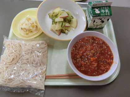 今日の献立は「ソフト麺、牛乳、ミートソース、蒸しパン、白菜とりんごのサラダ」でした。ソフト麺の献立のなかでも、ミートソースは子供たちが大好きなメニューです。今日もおいしくいただきました。