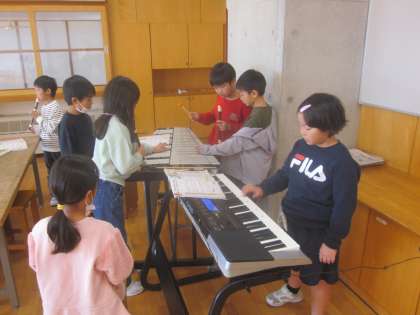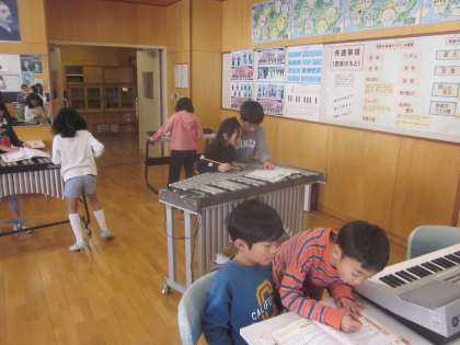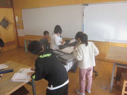 鉄琴、バスマスター、鍵盤ハーモニカ、リコーダーを使って合奏します。