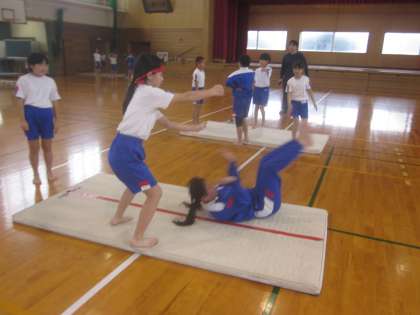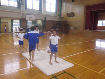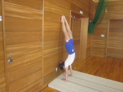 3年生以上は「壁登り倒立、壁倒立、(補助)倒立前転」に挑戦します。