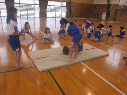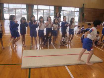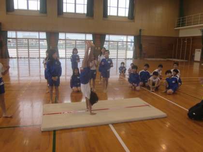 3年生も「壁登り倒立、壁倒立、(補助)倒立前転」に取り組みました。