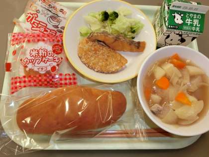 今日の献立は「コッペパン、牛乳、揚げ魚のレモン味又はハムカツ、添え野菜、ポトフ、いちごのカップケーキ、ガトーショコラ」でした。今日は、子供たちが楽しみにしていた、選択献立でした。自分で選んだ献立をおいしそうに食べていました。次回の選択献立は、2月になります。待ち遠しいですね。