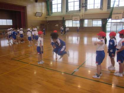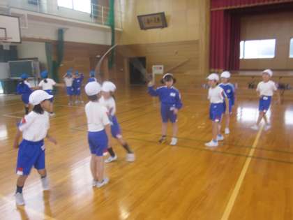 短なわ跳びの後は団ごとに分かれて長なわ跳びです。 連続で跳べるように頑張ります。