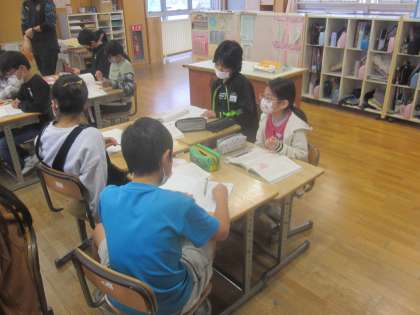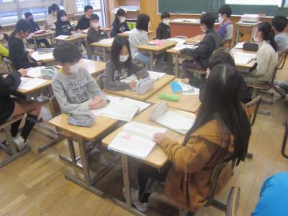 筆者の表現の工夫などについてお互いの考えを聴き合っています。