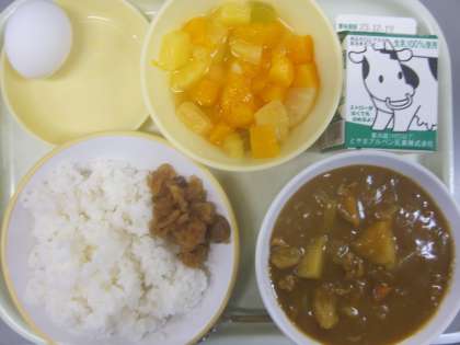今日の献立は「カレーライス、福神漬け、ゆで卵、フルーツゼリーミックス」でした。