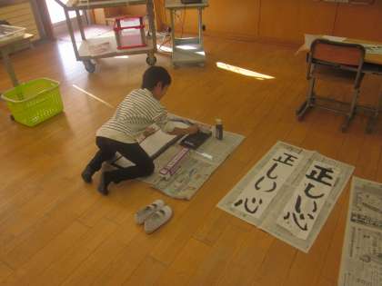 書き初めに取り組みました。 墨をたっぷりとつけ、力強く書きました。