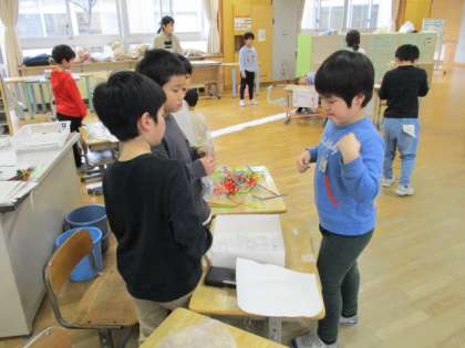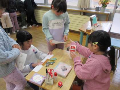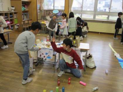 今日は、1組が 2組を招待しておもちゃランドを開きました。みんなに試してもらえて喜んでいました。