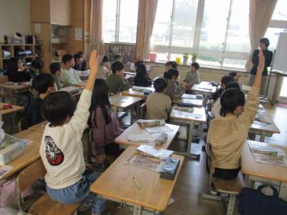 「What’s this?」のクイズに子供たちが楽しく答えています。とても盛り上がっています。