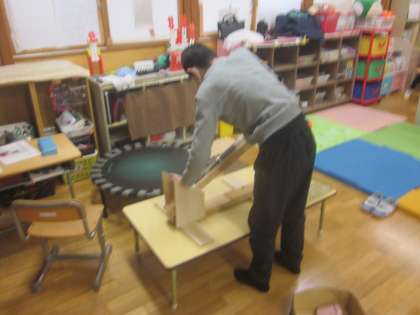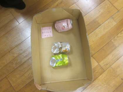 空き缶を上手に押さえてつぶしました。 腕力が付いてきました。