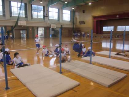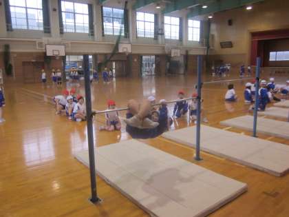 鉄棒検定練習の様子です。 昨年よりも上手になっています。
