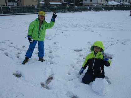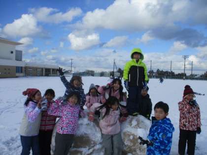 大きな雪玉が完成しました。みんな嬉しそうです。